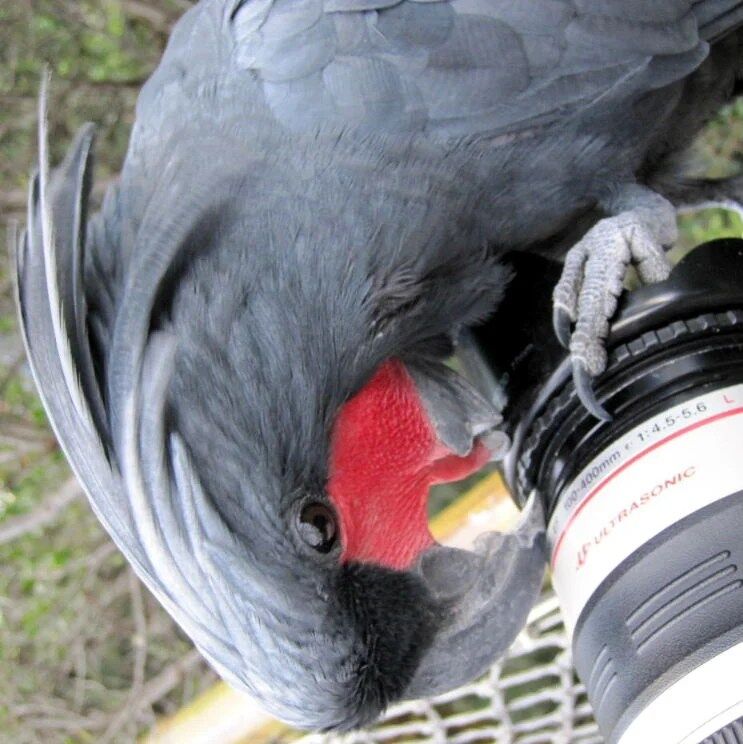 Black Palm Cockatoos exhibit the very rare animal behavior of using tools. The male cockatoo takes a stick and uses it as a drumstick on a tree before making its nest there. Researchers are not certain why the birds do this. It may be to mark its territory.