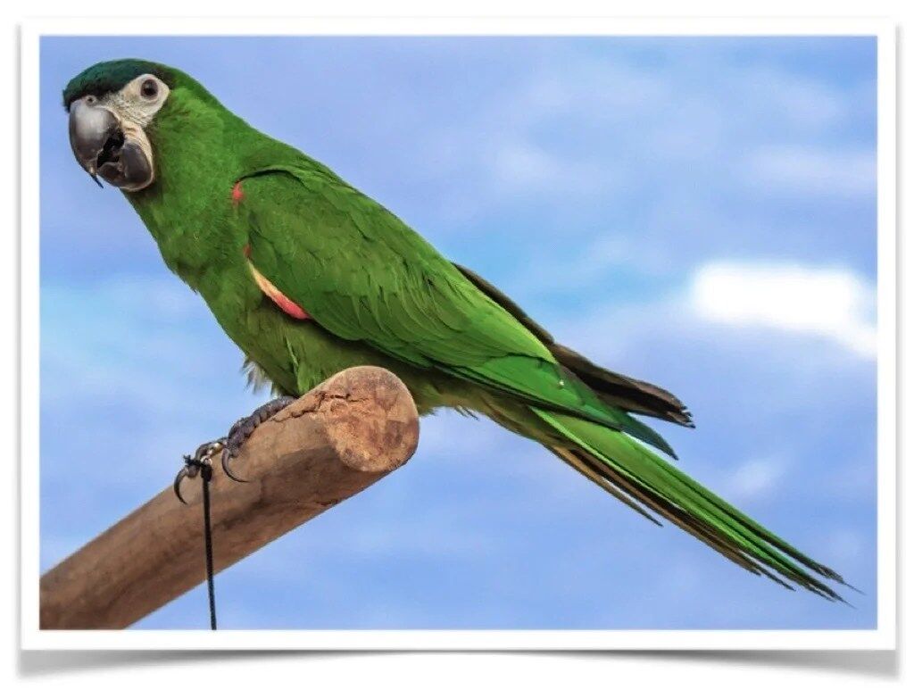 The Hahn’s Macaw is a smaller macaw in the parrot family, and one of two varieties of macaws belonging to the Red-Shouldered Macaws. The noble macaw (Ara nobilis cumanensis) is the other, and both are native to northern South America. In the wild, they live in Bolivia, Brazil, the Guianas, Peru, and Venezuela. In their natural environments they live in tropical lowlands, but also enjoy savannas and swamplands. Hahn’s Macaws have vibrant green feathering with bits of blue green around their head. These Macaws also have bright red on the undersides of their wings, earning them the nickname of ‘red-shouldered macaw’. Their beak is black with bits of beige and white in the upper beak and their eyes resemble a beautiful burnt orange hue, framed by classic white eye-rings. Buy Hahn’s Macaw Online