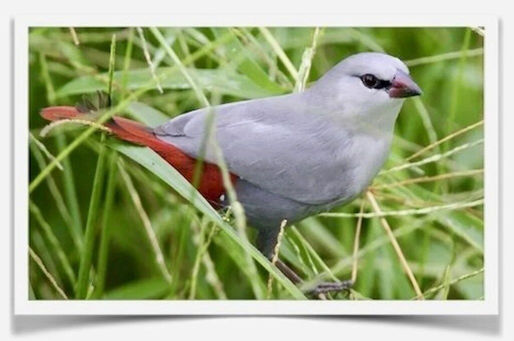The lavender waxbill (Estrilda caerulescens) is a common species of estrildid finch native to Central Africa and successfully introduced on Hawai’i. It has an estimated global extent of occurrence of 620,000 km. The Lavender Waxbill’s beak is dark crimson at base becoming black toward tip. Black eye markings extending from each side of the beak to slightly past the eye. Body is steel gray with a few small, white spots on the flanks; legs and feet: blackish brown; rump, tail coverts, undertail coverts, and crimson tail. The juvenile looks like a dull version of the adult and lacks the white flank spots. Lavenders definitely need an aviary or a well planted bird safe free flight room. This species will suffer if kept in a traditional cage for an extended time. They need ample space to fly, explore and forage. Problems such as feather plucking and obesity can sometimes be attributed to lack of exercise and overcrowding in small quarters. Buy Lavender Waxbill Online